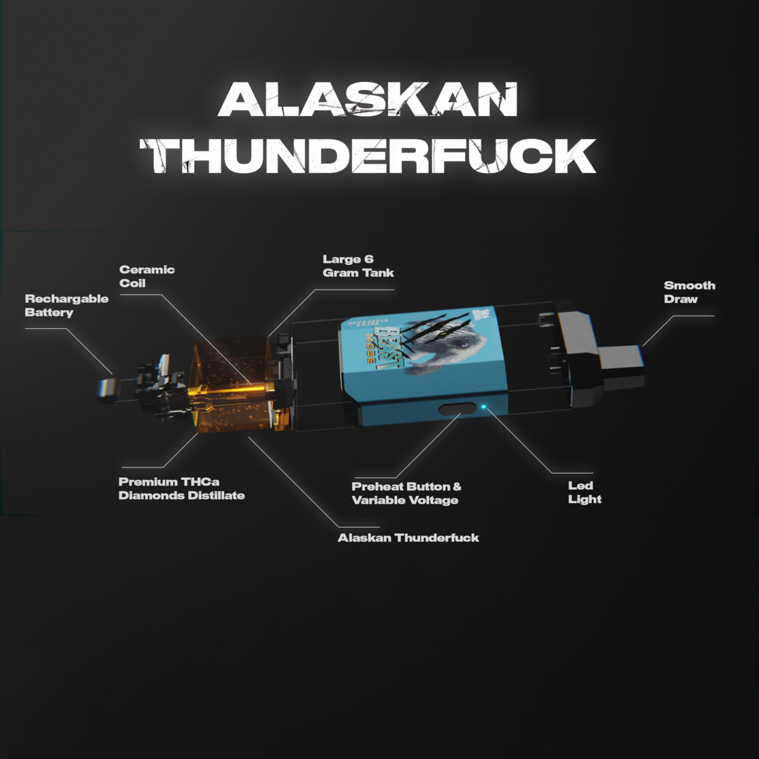 A blizzard of euphoria, a hail storm of happiness, a thunderstorm of absolute joy. Alaskan Thunderf*ck, one of the few strains all the way from Alaska, it’s named appropriately and unapologetically for its unf*cking believable 6 grams of THCa Diamonds. This strain is known for its omnipotent uplifting ferocity, perfect for an amazing day high as a powerful sativa breed. The fun doesn’t stop there with a unique sweet n spiced floral flavor profile.