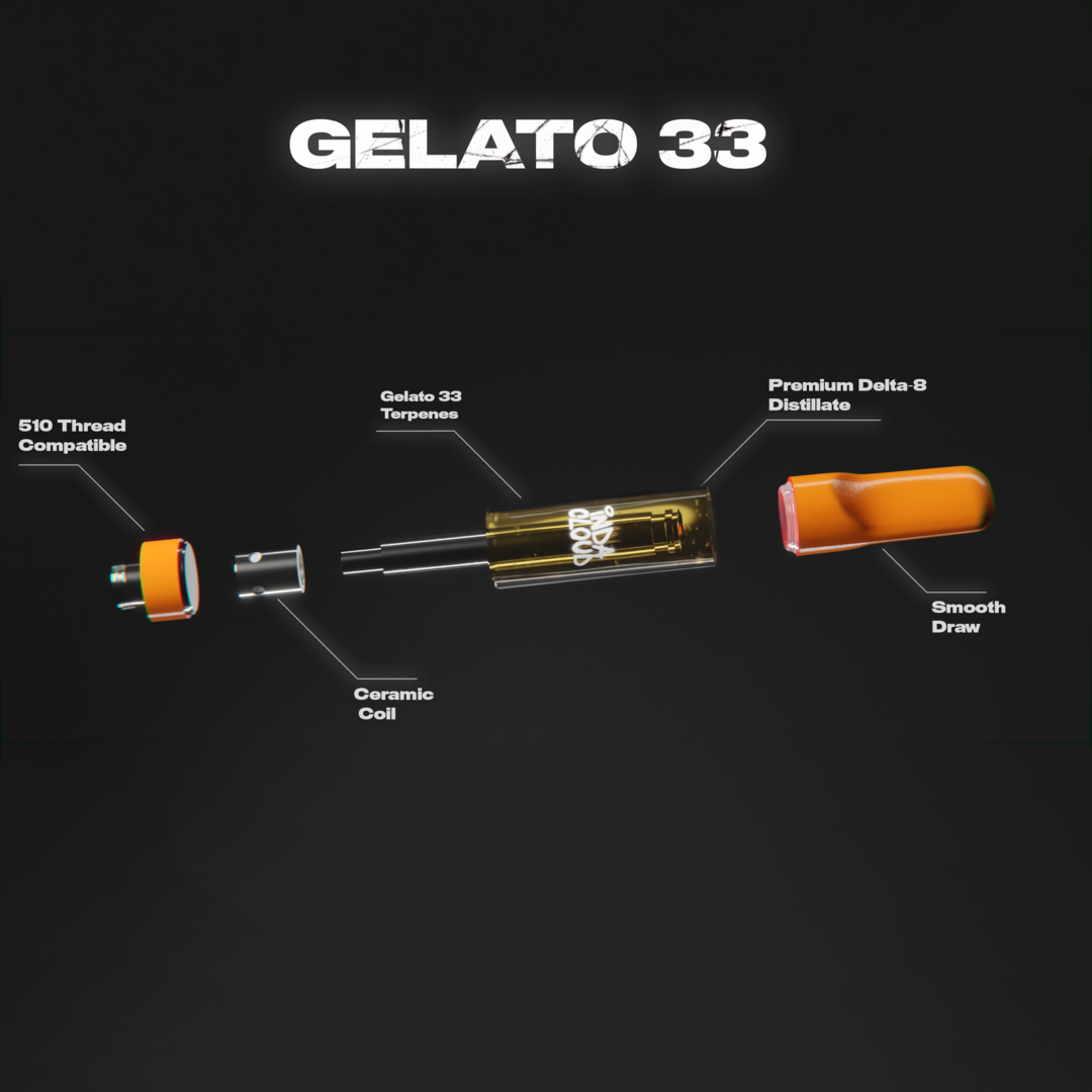 Each Gelato 33 Delta 8 Vape Cartridge from Indacloud contains a generous amount of 1 gram of product. This quantity ensures ample product for a sustained and enjoyable vaping experience. Each puff delivers a smooth, satisfying hit infused with rich flavors and beneficial Delta 8 THC. This cartridge size ensures you can enjoy the distinctive, premium blend of Thin Mint Girl Scout Cookies and Sunset Sherbert for a substantial period before needing a replacement. The 1-gram cartridge is designed with an emphasis on quality and quantity.