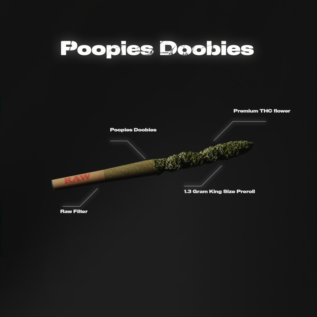 The CBD to Delta-8 THC ratio in each "Poopies Doobies" pre-roll is precisely calibrated to offer a balanced and enjoyable experience. While the specific ratio may vary slightly from batch to batch, the product is designed to harmonize the two cannabinoids perfectly. Including 2.6 grams of AAA prime CBD flower bathed in signature Delta 8 THC Distillate creates a blend that combines the potential therapeutic effects of CBD with the mildly intoxicating properties of Delta-8 THC. This synergy enhances relaxation, reduces stress, and promotes well-being without overwhelming psychoactive effects. The thoughtfully crafted ratio ensures that consumers can savor the benefits of both CBD and Delta-8 THC in a controlled and enjoyable manner.
